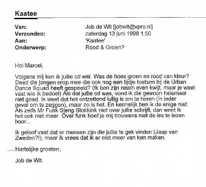 Mijn eerste discussie met een Nederlandse popjournalist was met Job de Wit in 1998. Job werkte toen bij de VPRO als radio-DJ en zou verstand hebben van funkmuziek. Ik had hem gevraagd waarom er bij VPRO-radio zo weinig funkmuziek te horen was en gaf hem wat informatie over Seven Eleven. Dat ons eerste album was geproduceerd door de New Yorkse funkartiest Menace, waarmee wij in 1995 in contact zijn gekomen via Geert van Itallie, thans directeur van de Melkweg. Dat ik, eveneens in 1995, samen met Seven Eleven bassist Dodge bij Bootsy Collins op bezoek ben geweest in Cincinnati, en dat Bootsy ons daarna uitnodigde om naar Parijs te komen om een samenwerking te bespreken. Hij trad daar op als special guest van gitarist Lucky Peterson in Le Zenith. Dan moet je als Nederlandse funkband toch wel iets betekenen. Job vond van niet. Over ons album ‘The Come Out’ schreef Job: ‘Was de hoes groen en rood van kleur? Deed die jongen erop mee die ook nog een tijdje toetsen bij de Urban Dance Squad heeft gespeeld? Als dat jullie cd was, vond ik die gewoon helemaal niet goed. En kennelijk ben ik de enige niet. Als zelfs Mr. Funk Sjeng Stokkink niet over jullie schrijft, dan weet ik het ook niet meer.’